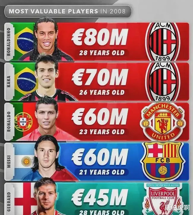 首先来回顾一下2008年欧洲身价排在前五位置的球员,巴西球星小罗以8000万欧元排名第一,上一年的金球奖得主卡卡则位列第2名。 此时的欧洲足坛即将迎来巨变,因为身价第3名的C罗在当年率领曼联获得了英超冠军和欧冠冠军,而他个人不仅获得了联赛金靴和欧冠金靴,更是在当年年底毫无悬念地获得了金球奖。身价榜单中排在第四的巴萨小将梅西虽然只有6000万身价,然而他的上升势头也呈现出几乎不可逆的趋势。 令人印象深刻的还有身价榜的第五名杰拉德仅在当年的金球奖评选中得到了28分,位列第10名。而要说到杰拉德球员...