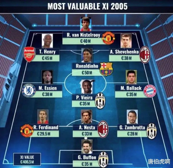 下面再来看看2005年足坛最贵的11人阵容,巴西球星小罗可以说是碾压式的存在。客观讲,唯一能和他抗衡一下的亨利和范尼也和巴西巨星完全不在一个层次上。这一年小罗收获了金球奖和世界足球先生两项个人最高荣誉,而且在足坛收入排行榜中(包含各项广告收入等)更是以2300万欧元位列第一,高出了排在第二名的贝克汉姆足足500万欧元!